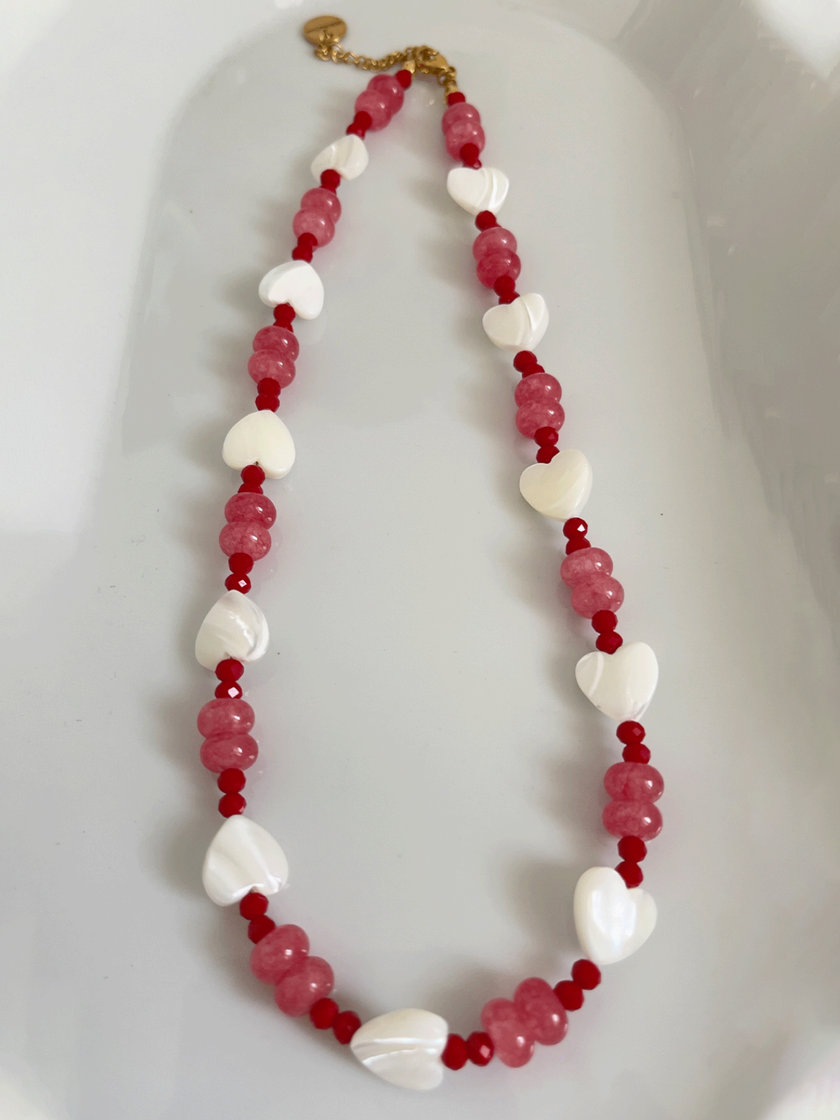 Collar hecho a mano con piedra Angelita Rosa y corazones de Nacar . Es una pieza con un toque romántico – Moderno